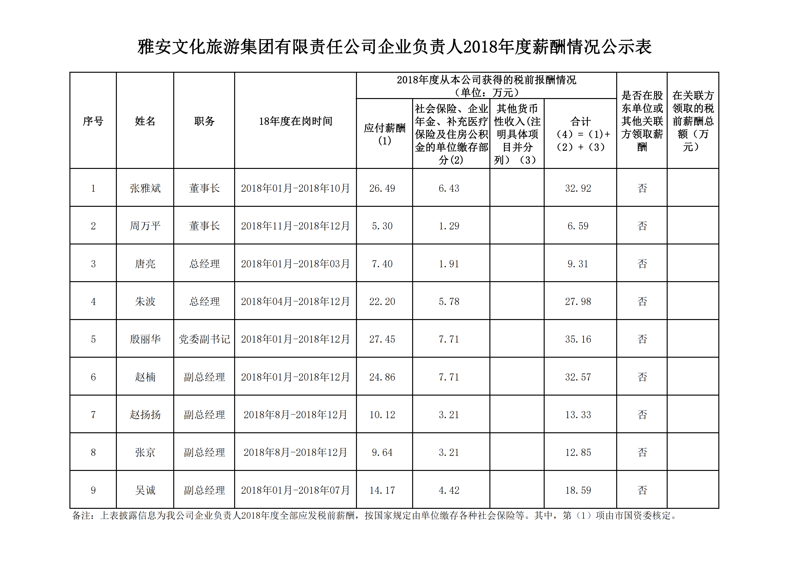 雅安文化旅游集團有限責任公司企業(yè)負責人2018年度薪酬情況公示表